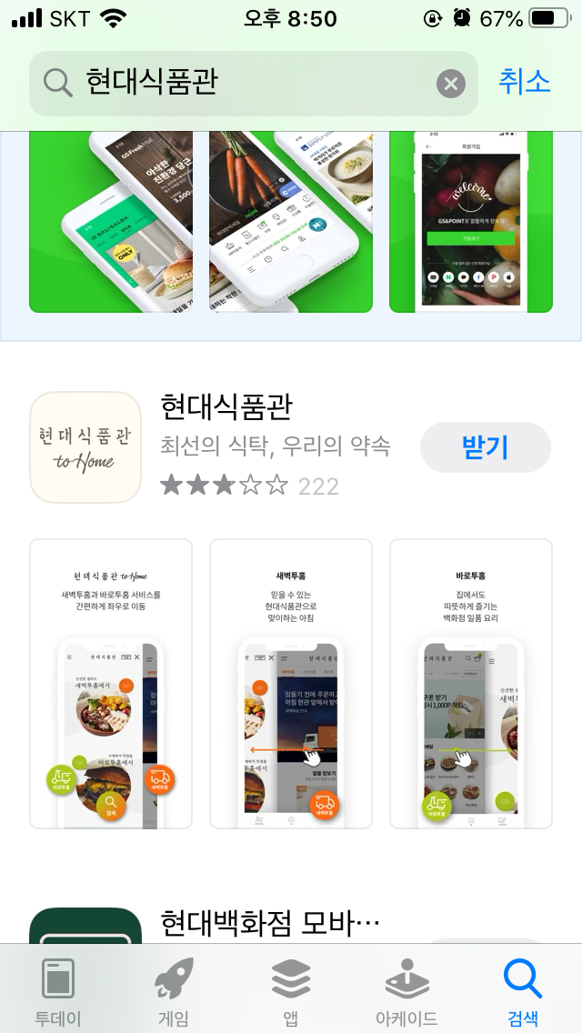 현대백화점 Hmall과 연계되어있는 현대 식품관 어플을 다운로드 받은 뒤